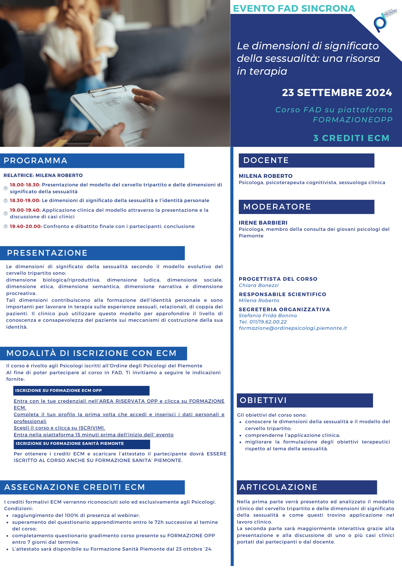 continua l’offerta formativa ECM in forma gratuita proposta dall’OPP alle Colleghe e ai Colleghi iscritti all’Albo, con l’evento dal titolo “Le dimensioni di significato della sessualità: una risorsa in terapia”, organizzato in collaborazione con la Consulta delle Giovani Psicologhe e dei Giovani Psicologi.
