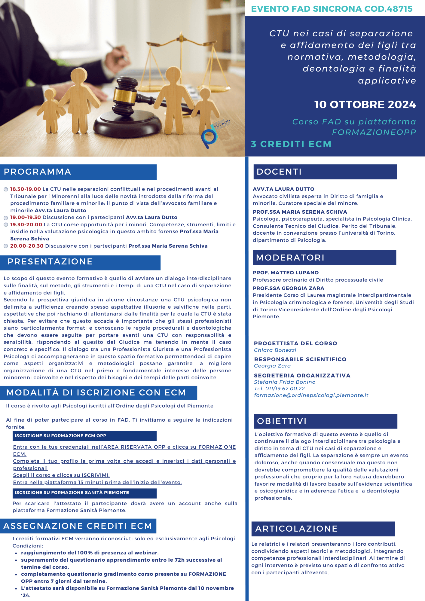 l’offerta formativa ECM in forma gratuita proposta dall’OPP alle Colleghe e ai Colleghi iscritti all’Albo con l’obiettivo di consentire di assolvere pienamente gli obblighi formativi previsti per legge, continua con l’evento dal titolo “CTU nei casi di separazione e affidamento dei figli tra normativa, metodologia, deontologia e finalità applicative”.