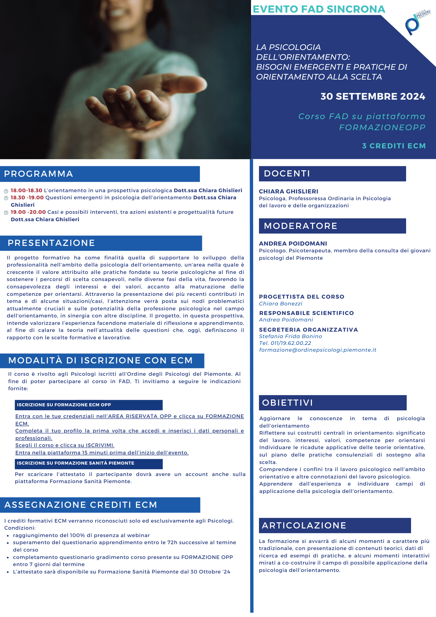 l’offerta formativa ECM in forma gratuita proposta dall’OPP alle Colleghe e ai Colleghi iscritti all’Albo con l’obiettivo di consentire di assolvere pienamente gli obblighi formativi previsti per legge, continua con l’evento dal titolo “La psicologia dell’orientamento: bisogni emergenti e pratiche di orientamento alla scelta”.