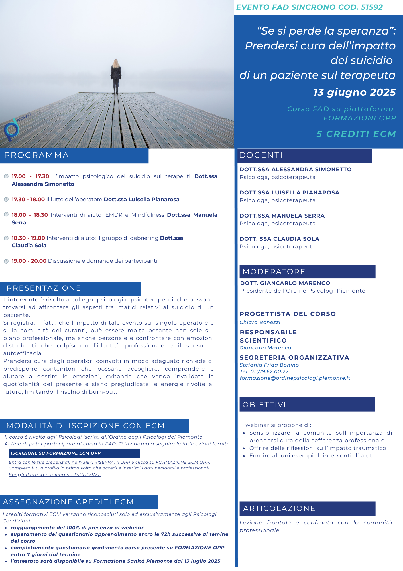 nell’ambito dell’offerta formativa ECM in forma gratuita 2025 l’OPP propone l’evento dal titolo “Se si perde la speranza: Prendersi cura dell’impatto del suicidio di un paziente sul terapeuta”.
