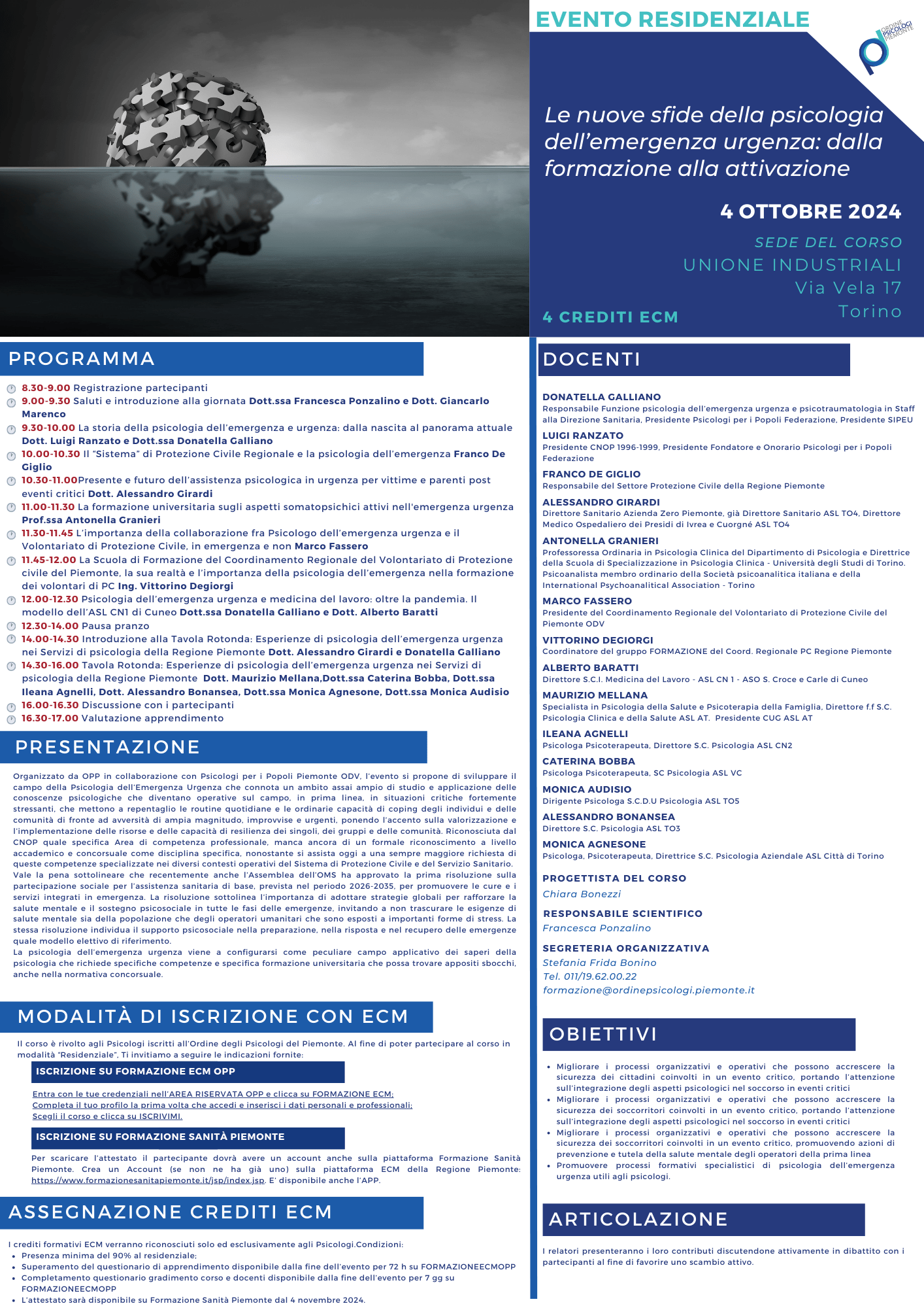 Organizzato da OPP in collaborazione con Psicologi per i Popoli Piemonte ODV, l’evento si propone di sviluppare il campo della Psicologia dell’Emergenza Urgenza che connota un ambito assai ampio di studio e applicazione delle conoscenze psicologiche che diventano operative sul campo, in prima linea, in situazioni critiche fortemente stressanti, che mettono a repentaglio le routine quotidiane e le ordinarie capacità di coping degli individui e delle comunità, ponendo l’accento sulla valorizzazione e l’implementazione delle risorse e delle capacità di resilienza dei singoli, dei gruppi e delle comunità. Riconosciuta dal CNOP quale specifica Area di competenza professionale, manca ancora di un formale riconoscimento a livello accademico e concorsuale come disciplina specifica, nonostante si assista oggi a una sempre maggiore richiesta di queste competenze specializzate nei diversi contesti operativi del Sistema di Protezione Civile e del Servizio Sanitario.
