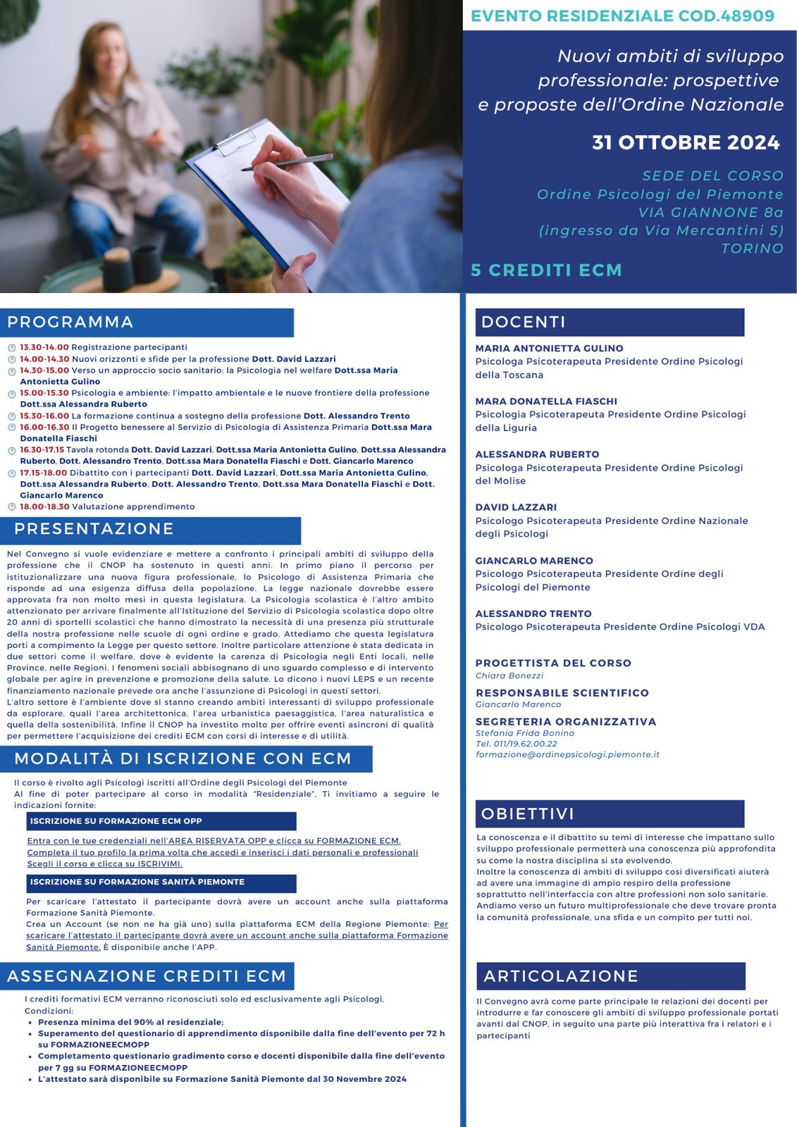 Il corso si terrà il 31 ottobre 2024, dalle ore 14.00 alle ore 18.30, presso la sede dell’Ordine degli Psicologi del Piemonte, in Via Mercantini 5, a Torino