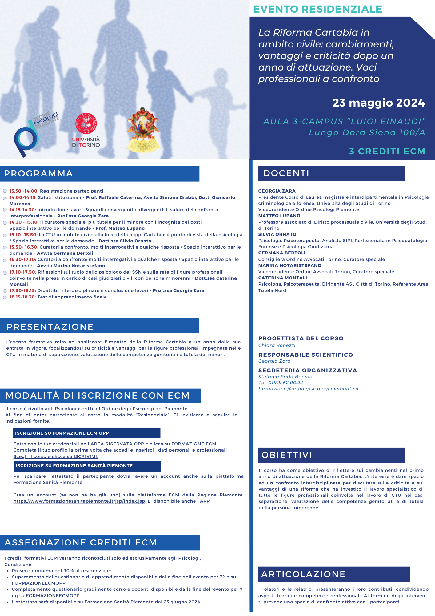 L’evento formativo mira ad analizzare l’impatto della Riforma Cartabia a un anno dalla sua entrata in vigore, focalizzandosi su criticità e vantaggi per le figure professionali impegnate nelle CTU in materia di separazione, valutazione delle competenze genitoriali e tutela dei minori.