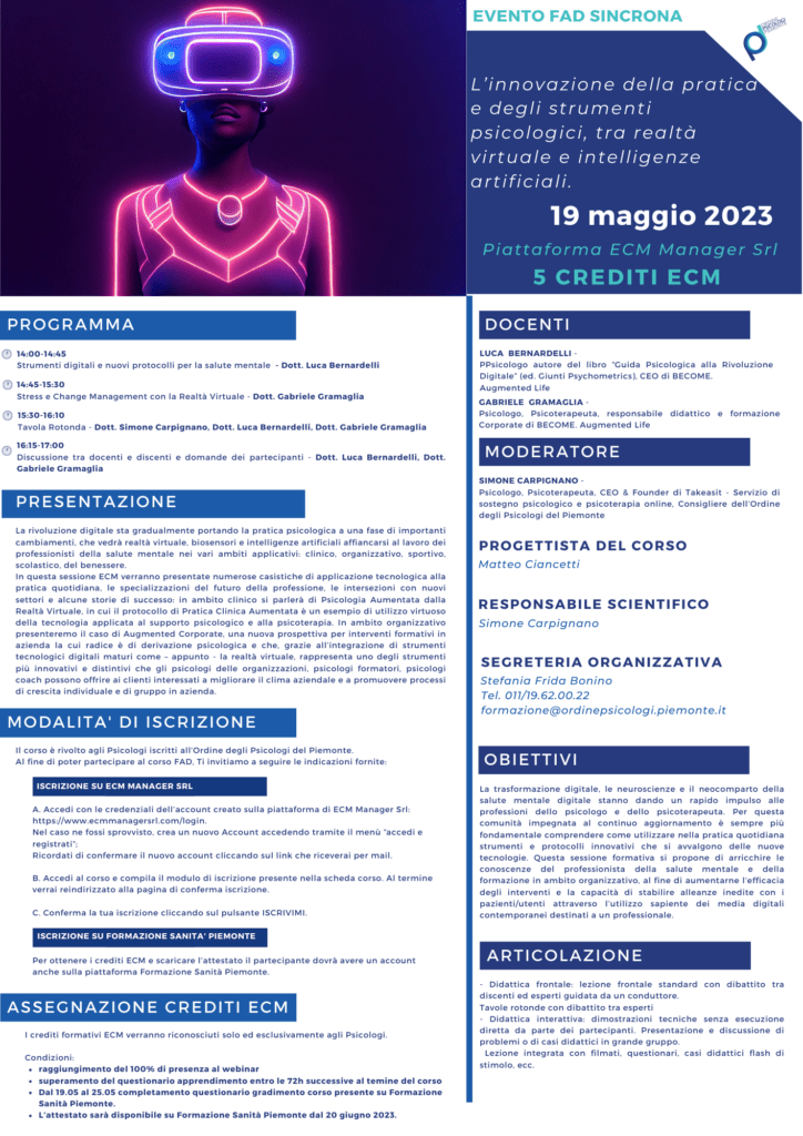 Il corso si terrà il 19 maggio 2023, dalle ore 13.30 alle ore 17.00, in modalità FAD.
